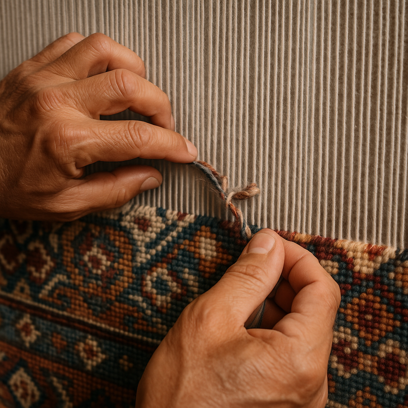 Ein handgeknüpfter Teppich entsteht durch ein aufwendiges Verfahren, bei dem jeder einzelne Knoten per Hand gesetzt wird. Die Fäden werden um die Kettfäden des Trägergewebes geschlungen und festgezogen – Knoten für Knoten, oft tausende Male pro Quadratmeter.