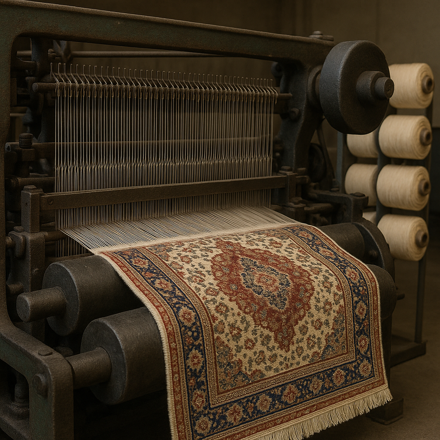Maschinengewebte Teppiche entstehen mithilfe automatisierter Webstühle, die eine präzise und gleichmäßige Fertigung ermöglichen. Im Gegensatz zur handgefertigten Produktion erfolgt der gesamte Webprozess – also das Verknüpfen von Kett- und Schussfäden – maschinell. Das spart Zeit und erlaubt eine effiziente Serienproduktion.